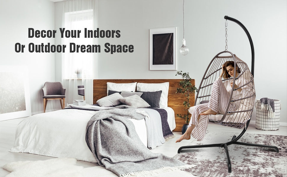 FASHION DESIGN - This fun egg shaped porch swing chair is the perfect addition to your backyard, patio, garden or balcony. It comes with a stand base so it can be placed anywhere.